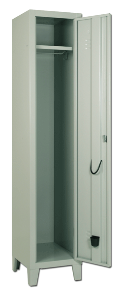 Armadio spogliatoio a 1 posto di lamiera verniciata. Struttura monoblocco con dimensioni cm 37x35x180. Porta con nervatura interna di rinforzo, feritoie di areazione, portacartellino per nome e sistema di chiusura a chiave. Vano interno dotato di pianetto con sottostante asta portagrucce e ganci laterali, anello porta ombrelli e vaschetta raccogli gocce.