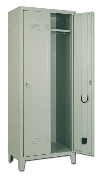 Armadio spogliatoio a 2 posti di lamiera verniciata. Struttura monoblocco con dimensioni cm 70x35x180. Porte con nervatura interna di rinforzo, feritoie di areazione, portacartellino per nome e sistema di chiusura a chiave. Vani interni dotati di pianetto con sottostante asta portagrucce e ganci laterali, anello porta ombrelli e vaschetta raccogli gocce.