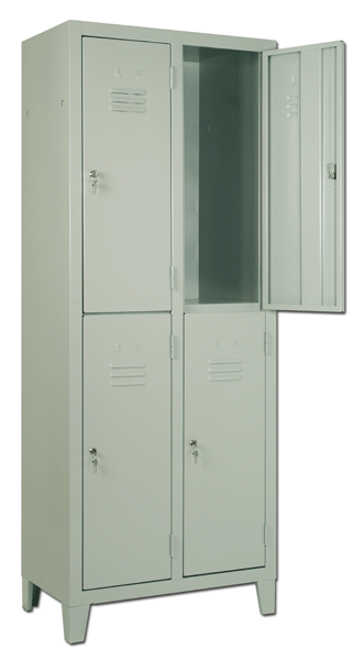 Armadio spogliatoio a 4 posti (2+2) di lamiera verniciata. Struttura monoblocco con dimensioni cm 70x35x180. Dimensioni del singolo vano cm 35x35x90. Porte con nervatura interna di rinforzo, feritoie di areazione, portacartellino per nome e sistema di chiusura a chiave. Vani interni dotati di attaccapanni in metallo fissato allo schienale.