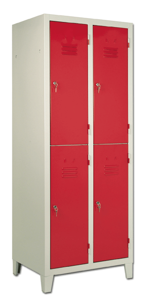 Armadio spogliatoio a 4 posti (2+2) di lamiera verniciata con porte colorate. Struttura monoblocco con dimensioni cm 70x35x180. Dimensioni del singolo vano cm 35x35x90. Porte con nervatura interna di rinforzo, feritoie di areazione, portacartellino per nome e sistema di chiusura a chiave. Vani interni dotati di attaccapanni in metallo fissato allo schienale.