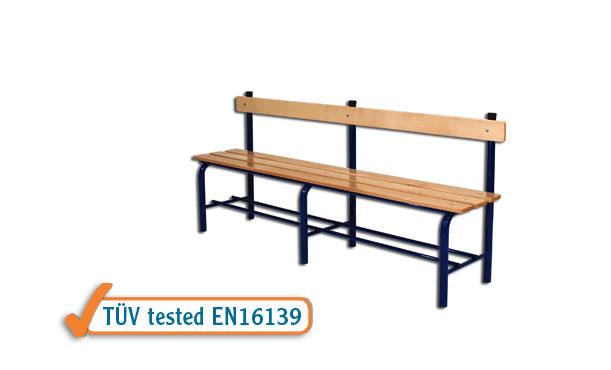 Panchina spogliatoio da mt 2 completa di schienale. Struttura in tubolare di acciaio verniciato diametro mm 40 con sottostante ripiano porta scarpe. Sedile e schienale a listoni di legno massiccio verniciato sezione mm 100×21. Punti di appoggio gommati. Dimensioni complessive cm 200x40x85.