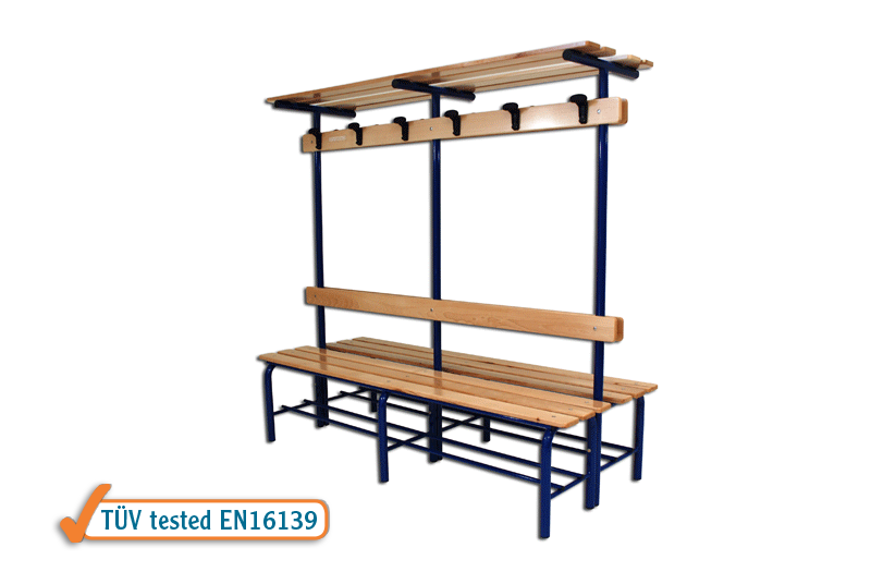 Panchina spogliatoio da mt 2, modello ad isola per posizionamento a centro locale. Completa di schienale, attaccapanni e tettuccio. Struttura in tubolare di acciaio verniciato diametro mm 40 con sottostante ripiano porta scarpe. Sedile, schienale, tavola attaccapanni e tettuccio in listoni di legno massiccio verniciato, sezione mm 100×21. Completa di nr 12 grucce appendiabito. Punti di appoggio gommati. Dimensioni complessive cm 200x80x185.