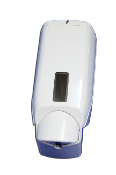 Distributore di sapone liquido di plastica da fissare a parete. Erogazione a pulsante. Finestrella di controllo. Completo di organi di fissaggio.