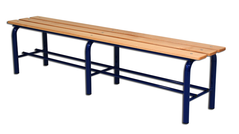 Panchina spogliatoio semplice da mt 2. Struttura in tubolare di acciaio verniciato diametro mm 40 con sottostante ripiano porta scarpe. Sedile a listoni di legno massiccio verniciato sezione mm 100×21. Punti di appoggio gommati. Dimensioni complessive cm 200x35x45.
