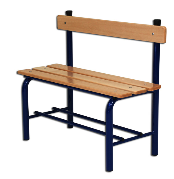 Panchina spogliatoio da mt 1 completa di schienale. Struttura in tubolare di acciaio verniciato diametro mm 40 con sottostante ripiano porta scarpe. Sedile e schienale a listoni di legno massiccio verniciato sezione mm 100×21. Punti di appoggio gommati. Dimensioni complessive cm 100x40x85.
