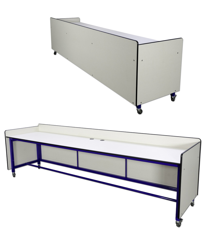 Tavolo per giuria con struttura portante in tubolare di acciaio verniciato. Piano di lavoro, pannelli frontali e laterali di bilaminato, con finitura arrotondata anti trauma. Completo di 4 ruote piroettanti, autobloccanti. Dimensioni cm 300x70x76h.