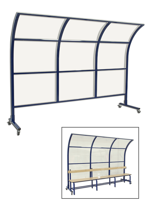 Protezione posteriore per tavolo giuria e per panchine riserve ed allenatori. Struttura in tubolare di acciaio verniciato con pannellatura realizzata in trasparente policarbonato antiurto da mm 3 di spessore. Elementi modulari mobili su ruote girevoli dotate di freno e montate su piede facilmente agganciabile alla struttura principale. PRezzo al mt