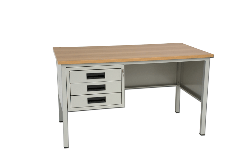 Scrivania a 3 cassetti. Struttura di metallo verniciato a fuoco con punti di appoggio gommati, piano di bilaminato. Cassettiera con chiusura a chiave. Dimensioni cm 130x76x78.