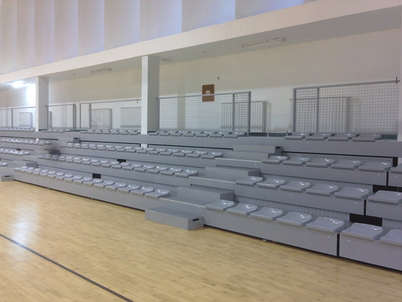 Tribuna telescopica per interni a movimentazione manuale o elettrica, struttura di acciaio verniciato, piani di seduta di legno o a scocche di polipropilene, corridoi, scale e parapetti secondo normativa corrente, totalmente personalizzabili nelle dimensioni e nelle finiture