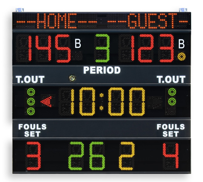 Tabellone elettronico multisport FS130N, dimensioni cm 200×180, trasmissione via cavo. Indicazione tempo di gioco, punteggio delle due squadre, periodo, bonus, timeout, posesso/servizio/turno, falli di squadra o set vinti, estremi ultimo fallo. Segnale acustico. Nomi delle due squadre programmabili. FIBA – Level 1 e Level 2
