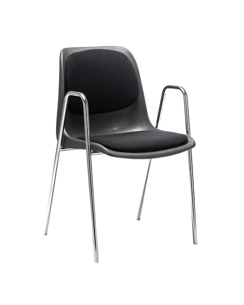 Sedia imbottita con struttura metallica cromata, scocca di polipropilene colorato con imbottitura su seduta e schienale, impilabile ed agganciabile.