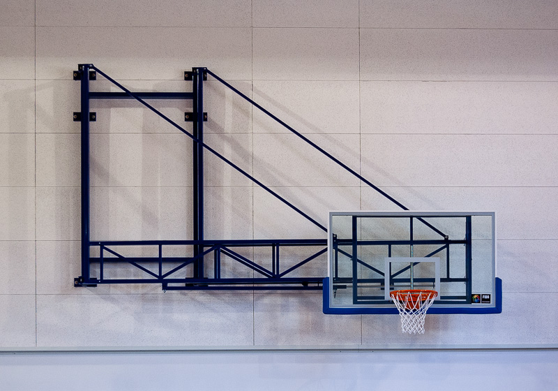 Impianto basket a muro modello TREVI chiudibile lateralmente a libro interamente in acciaio verniciato. Telaio di sostegno a parete in tubolare di grossa sezione (eventualmente personalizzabile a disegno per adattamento a particolari situazioni esistenti). Robusta struttura di sbalzo in tubolari di acciaio con movimento su boccole autolubrificanti e speciali cuscinetti a sfere. Ricerca automatica a scatto delle posizioni di gioco e riposo. Tiranti di sicurezza in tubolare di acciaio. Sbalzo di cm 325. Completo di tabelloni in cristallo temperato, spessore mm 12 con pellicola di sicurezza, montati su telaio in acciaio verniciato con protezione in poliuretano. Canestri reclinabili in acciaio verniciato con retine in cotone. Approvato FIBA per competizioni di secondo livello.