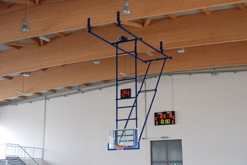Impianto pallacanestro TOP a soffitto chiudibile verso l’alto. Struttura montata su 2 robusti architravi in tubolare di acciaio verniciato a grossa sezione, realizzato a disegno per potersi conformare alla situazione esistente (travi in legno lamellare, calcestruzzo o struttura di acciaio). Struttura mobile di supporto del tabellone e del canestro realizzata in tubolari di acciaio verniciato e dimesionata in modo da permettere l’appiattimento del tabellone verso il soffitto in fase di chiusura dell’impianto. Incluso di argano elettrico avvolgicavo, cavo di acciaio, carrucole e cavi di sicurezza. Completo di tabelloni in cristallo temperato, spessore mm 12 con pellicola di sicurezza, montati su telaio in acciaio verniciato con protezione in poliuretano. Canestri reclinabili in acciaio verniciato con retine in cotone. Sbalzo medio verticale mt 7/8 di altezza. Sbalzo medio orizzontale mt 3,20. Approvato FIBA per competizioni di secondo livello.