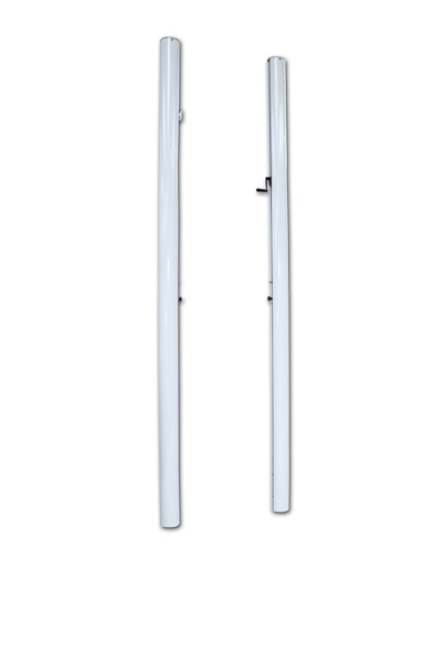 Impianto pallavolo monotubolare in alluminio verniciato. Palo in alluminio a sezione ovale di mm 120×100 con rinforzi interni anti flessione e sistema interno scorrevole di regolazione dell’altezza della rete con bloccaggio a volantino. Completo di dispositivo tendirete integrato in uno dei due pali costituenti l’impianto. Comprese bussole da cementare e tappi copri bussola in alluminio.