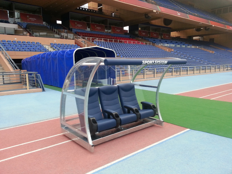 Panchina riserve e allenatori modello “Marrakech”, copertura in acciaio zincato con pannelli di policarbonato trasparente mm 3, completa di elementi laterali, su pedana in acciaio zincato con superficie di alluminio e ruote girevoli integrate sul fondo, poltrone in ecopelle personalizzabili, protezione paraspigoli. Altezza totale contenuta in soli cm 165.