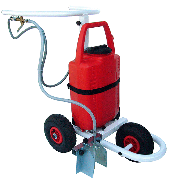 Carrello segna campo a vernice ecologica. Struttura in tubolare di acciaio verniciato montata su ruote gommate. Serbatoio di ABS con pompa azionata da motore a scoppio. Terza ruota di allineamento e dispositivo di spruzzo regolabile in larghezza.