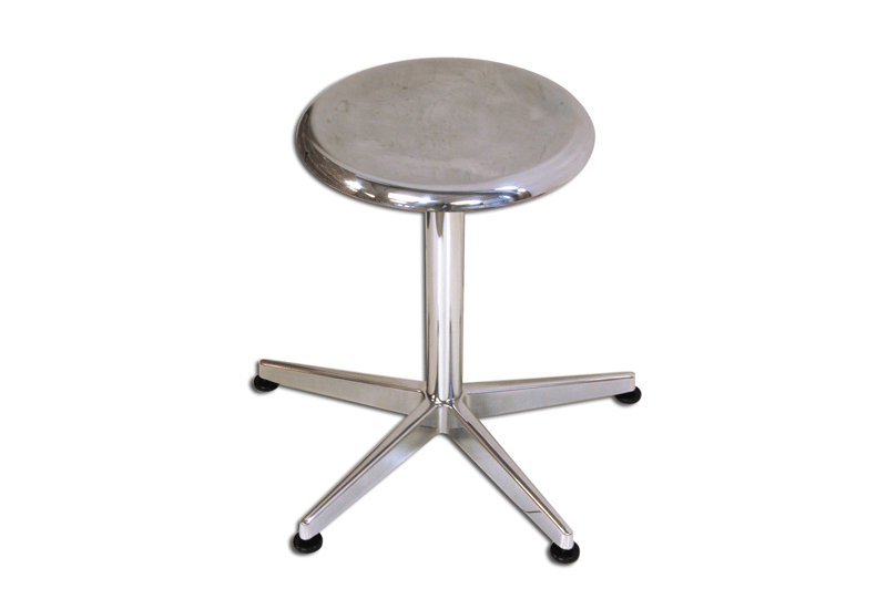 Sgabello girevole con struttura di alluminio e piedini in gomma. Regolabile in altezza a mezzo vite senza fine.