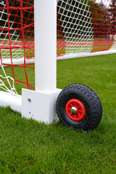 Coppia porte gioco calcio regolamentari a norma UNI EN 748, modello mobile con base. Realizzate in profilato di alluminio con sezione ovale di mm 120×100, rinforzato con nervature interne antiflessione. Giunzioni angolari in fusione di alluminio ad innesto. Complete di base posteriore di sostegno realizzata in profilo di alluminio con predisposizione per inserimento ruote di trasporto e ganci di plastica per attacco reti. Modello con traversa in due elementi unibili con innesto interno. Dimensioni interne regolamentari cm 732×244.
