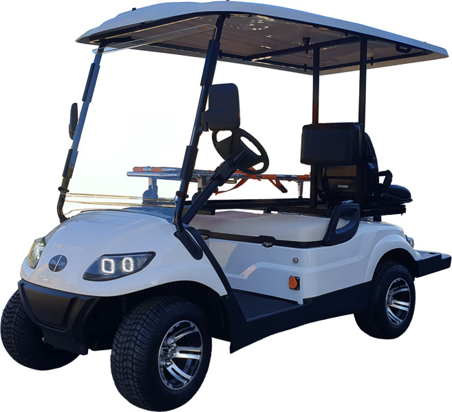 Veicolo ambulanza per campi calcio con supporto per barella e seduta per assistente medico, motore elettrico con funzionamento a batteria, fornito completo di carica batterie e barella pieghevole in alluminio