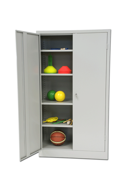Armadio porta attrezzi di lamiera verniciata ad ante battenti con 4 ripiani posizionabili ad altezza variabile. Dimensioni cm 100x45x200. Chiusura a chiave.