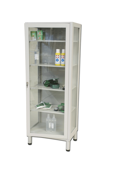 Armadio con pareti a vetri temperati e singola anta a battente. Dotato di 4 ripiani interni posizionabili ad altezza variabile. Dimensioni cm 80x40x180. Chiusura a chiave. Piedini regolabili.