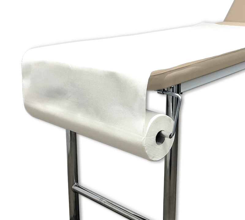 Porta rotolo per lettino visita medica, in acciaio cromato con attacchi di plastica rigida.