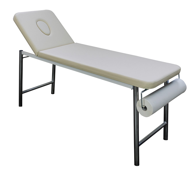 Lettino visita medica. Struttura di acciaio cromato e verniciato, piano di appoggio e testiera reclinabile imbottiti e rivestiti di skay lavabile. Dimensioni totali della superficie cm 190×60. Completo di foro per respirazione e tappo
