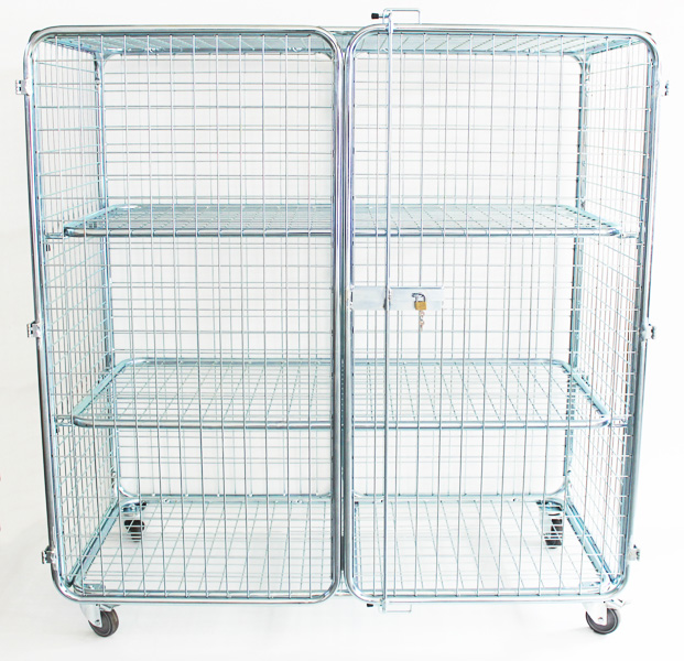 Armadio porta attrezzi con pareti in rete metallica e 2 ripiani, dimensioni cm 155x75x160, mobile su ruote, smontabile