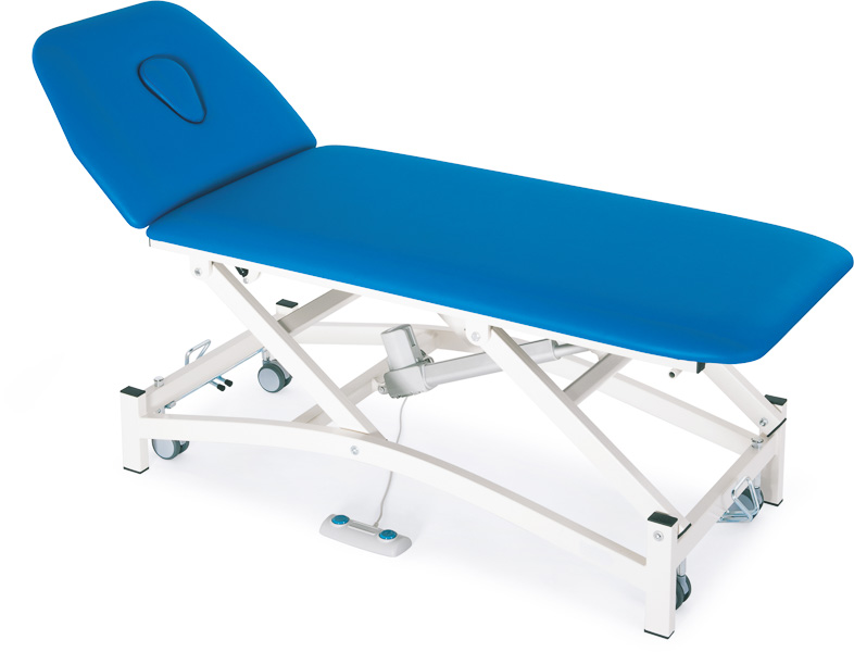 Lettino per massaggi a due segmenti imbottiti e rivestiti in similpelle, regolabili elettricamente in altezza ed inclinazione. Struttura in acciaio verniciato. Testiera con foro per respirazione. Dimensioni totali della superficie cm 190×65.