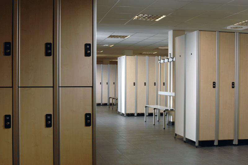 Armadio spogliatoio realizzato mediante pannelli di laminato stratificato su profili in alluminio. Colonna con due vani aventi dimensioni cm 30x50x90. Serrature a chiave con placca esterna dotata di vano porta numero. Vani interni dotati di ripiano, asta porta grucce in alluminio e gruccia appendiabiti. Piedini regolabili.