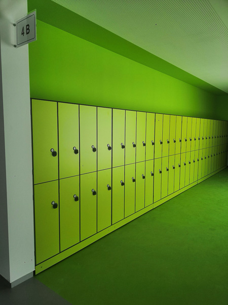 Armadio spogliatoio realizzato mediante pannelli di laminato stratificato su profili in alluminio. Nr 3 colonne con singolo vano avente dimensioni cm 30x50x180. Serrature a chiave con placca esterna dotata di vano porta numero. Vani interni dotati di ripiano, asta porta grucce in alluminio e gruccia appendiabiti. Piedini regolabili.