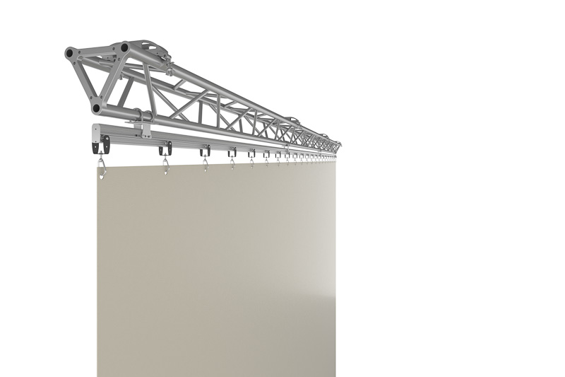 Tenda divisoria per campi da gioco realizzata in tessuto ignifugo a singolo telo, scorrimento manuale su binario