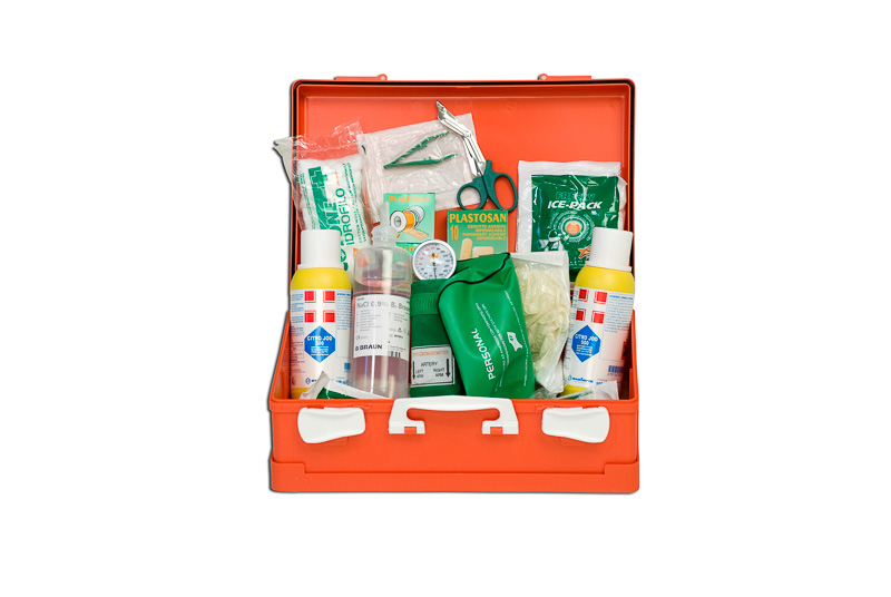 Cassetta medica portatile applicabile a parete con kit accessori secondo d.m. 388. Scocca in plastica rigida. Sganciabile e facilmente trasportabile con maniglia.
