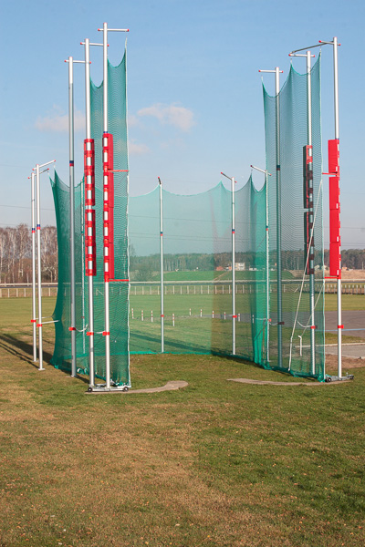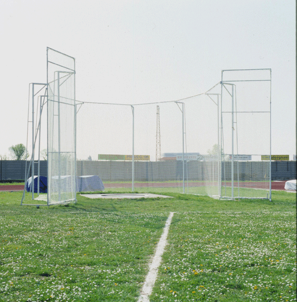 Gabbia per lancio del disco e del martello, struttura di acciaio verniciato a caldo, da fissare a terra mediante bussole da interrare, montanti in tubolare a grossa sezione muniti di controventature rigide. Altezza mt 7, completa di portelloni mobili altezza mt 10 e rete di nylon, diametro mm 4, maglia 4×4. Regolamentare secondo norme FIDAL.