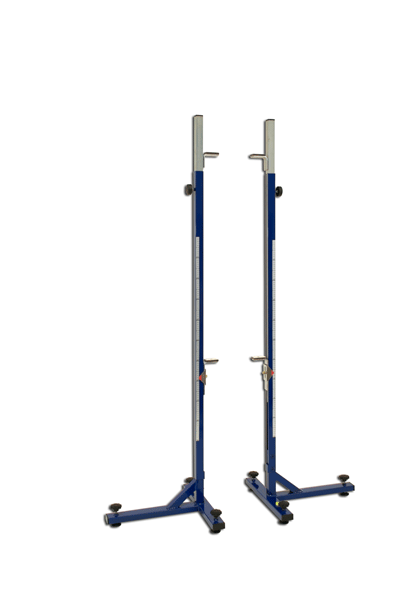 Coppia ritti per salto in alto. Asta centimetrata fino a cm 200 in tubolare di acciaio zincato, basamento a T in tubolare di acciaio verniciato. Con cursori di supporto dell’asta in acciaio zincato, scorrevoli e bloccabili a qualsiasi altezza.