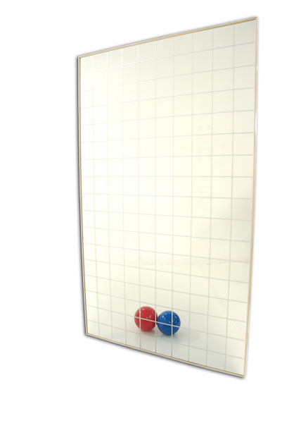 Specchio quadrettato di cristallo temperato con reticolo cm 10×10. Montato su pannello di legno con cornice perimetrale di legno massiccio verniciato al naturale. Dimensioni cm 100×200. Mobile su carrello di acciaio verniciato con ruote piroettanti. Inclinazione regolabile.
