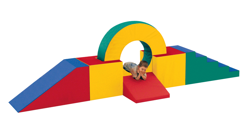 Percorso gioco: scala, ruota, supporto ruota, cuneo, scivolo. Elementi in materiale espanso, densità 30 Kg/mq, rivestito di pvc colorato.