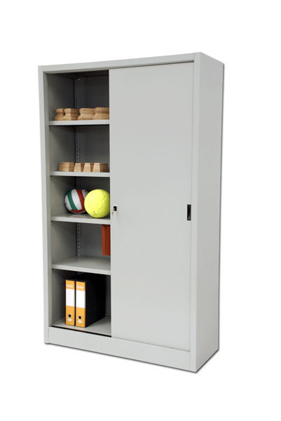 Armadio porta attrezzi di lamiera verniciata a polveri epossidiche. Dotato di 2 ante scorrevoli, serratura, 4 ripiani interni spostabili. Dimensioni cm 120x45x200h.