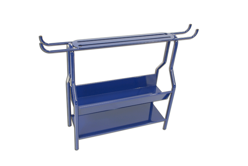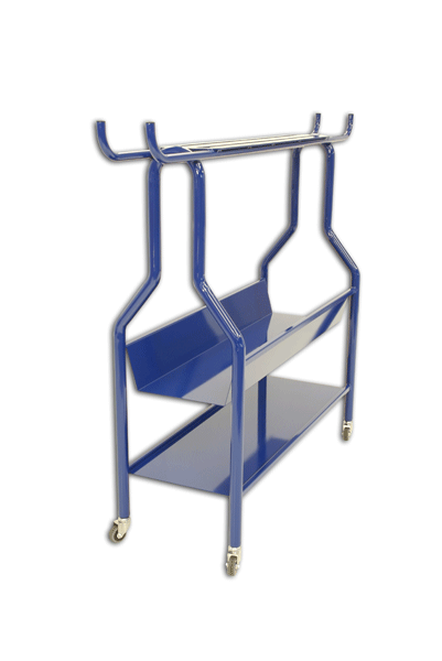 Mobile porta attrezzi in tubolare di acciaio verniciato a 3 ripiani. Completo di 4 ruote gommate piroettanti. Capacità: 40 clave, 100 bastoni, 60 appoggi, 25 cerchi, 25 funicelle.
