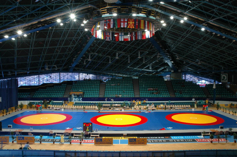 Tappeto lotta libera e greco romana. Interno di agglomerato e rivestimento superiore di vinile, fondo antiscivolo. Densità 150 Kg/mc, dimensioni cm 200x100x5. Omologato FILA.
