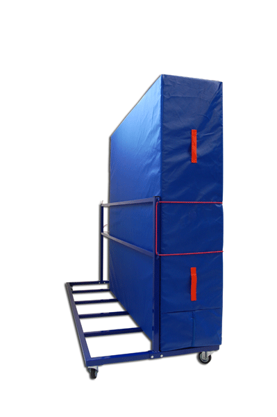 Materasso per zone caduta “Manoni” di gomma espansa rivestita di pvc, dimensioni cm 400x200x40, composto di due elementi con taglio a 45° accostabili mediante velcro. Densità 16 Kg/mc. Dotato di maniglie per trasporto, sfiati e zip.