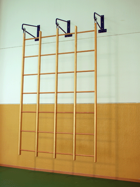 Quadro svedese oscillante a 36 fori (6×6). Mensole di sostegno in tubolare di acciaio con piastra da fissare a parete mediante tasselli. Attrezzo composto di montanti di legno massiccio, dimensioni mm 90×45, e pioli di faggio evaporato, diametro mm 35. Accostamento a parete tramite carrucole di acciaio zincato. Dimensioni cm 335x350h.