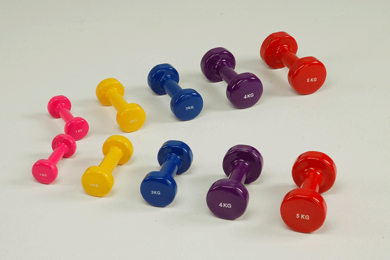 Manubri di ghisa rivestiti di PVC colorato, disponibili nei modelli da kg 1,2,3,4,5. Prezzo al kg