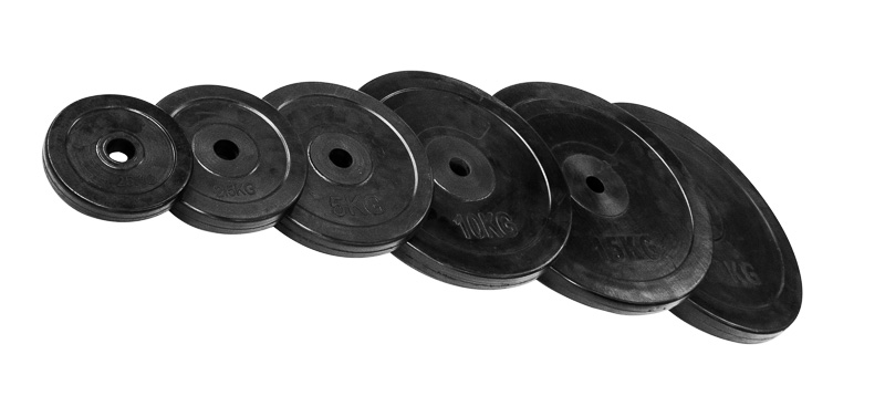Dischi di ghisa interamente ricoperti di gomma, foro diametro mm 26, disponibili nei pesi di kg 1; 2; 5; 10; 15; 20. Prezzo al kg