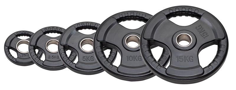 Dischi olimpionici in ghisa gommata, foro diametro mm 50, impugnatura tri-grip per facilitare la presa. Prezzo al kg