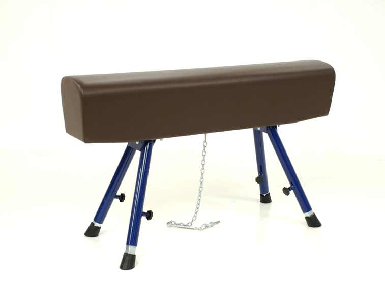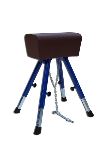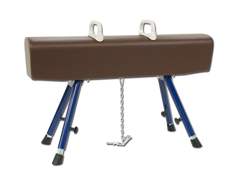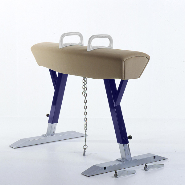 Cavallo olimpionico da competizione. Gambe in doppio tubolare di acciaio con ricerca automatica a scatto delle varie altezze e carrello per trasporto incorporato. Catena con tenditore e tassello di ancoraggio a pavimento. Fusto di legno imbottito e rivestito di finta pelle scamosciata. Completo di maniglie di legno lamellare montate su supporti in fusione di lega di alluminio regolabili in larghezza.