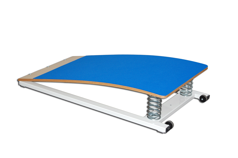 Pedana elastica con piano in multistrati di faggio ad incollaggio fenolico rivestito di moquette. Molleggio ottenuto con 2 molle di acciaio ad alto spessore e resistenza. Punti di appoggio a terra gommati antiscivolo, dimensioni cm 120x60x16h.
