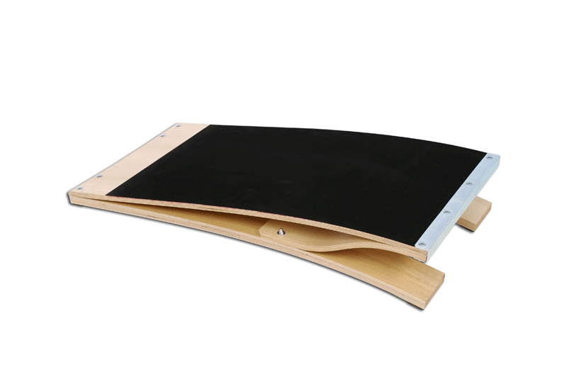 Pedana elastica di multistrati di faggio ad incollaggio fenolico verniciato al naturale. Piano di battuta ricoperto di gomma antisdrucciolevole, spessore mm 1, appoggi a terra di gomma antiscivolo, dimensioni cm 120x60x16h.