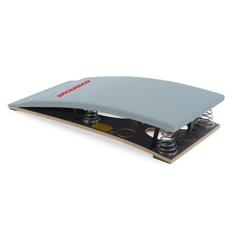 Pedana elastica omologata F.I.G. per competizioni. Doppio molleggio, regolabile. Piano in legno imbottito e rivestito. Struttura in acciaio verniciato con ruote per trasporto.