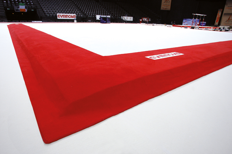 Pedana per ginnastica artistica omologata F.I.G. per competizioni. Composta da piattaforma in legno con dimensioni mt 13×13 e spessore cm 10 in moduli agganciati tramite profili e placche di giunzione; gomma dinamica spessore cm 4 in strice agganciabili tramite fasce in velcro; rivestimento superiore in moquette, dimensioni mt 14×14 in 3 strisce unibili tramite velcro con delimitazione in differente colore del perimetro.